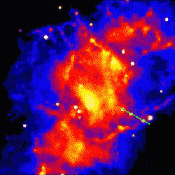 Continuum emission from the Crab Nebula. The pulsar is the lower of the central pair of stars. The green line indicates the path of the asteroid 1089 Tama through all three frames |